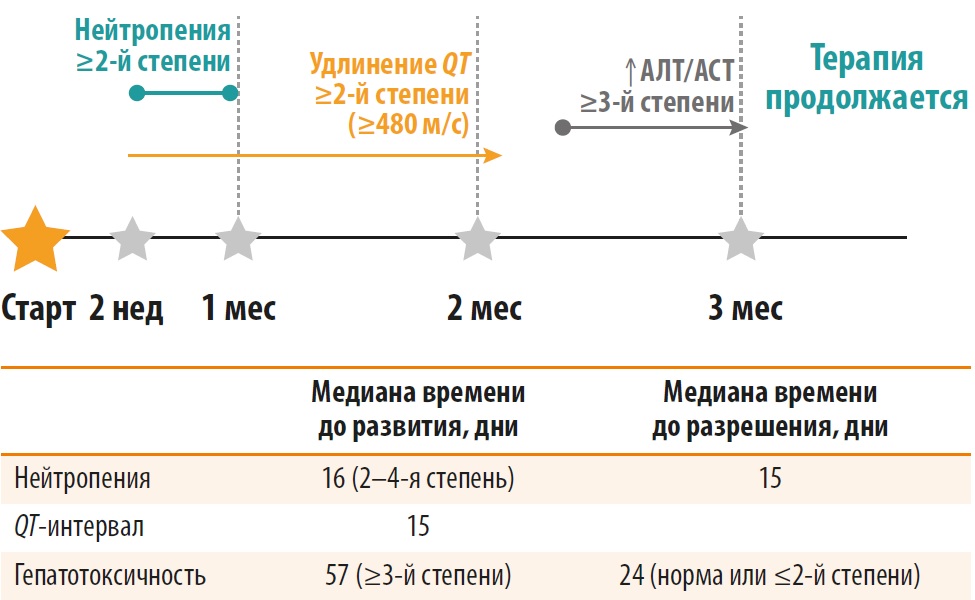НЯ специального интереса развиваются в разные сроки после начала терапии (рис. 2), поэтому в первые 3 мес терапии рибоциклибом необходимо осуществлять мониторинг состояния здоровья пациентки: 1 раз в 2 нед в течение 1-го месяца терапии необходим анализ крови для определения уровня нейтрофилов; электрокардиография и контроль за удлинением QT-интервала необходимы в первые 2 мес от начала терапии; контроль уровня АЛТ и АСТ – на 3-м месяце от начала терапии [32]. Резюмируя данные по НЯ при терапии рибоциклибом, можно заключить, что мониторинг развития НЯ позволяет сохранять эффективную терапию.