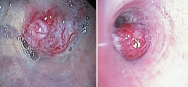 Для метастазов РМЖ характерна экзофитная опухоль розово-красного или белесовато-розового цвета с неровной поверхностью, без инфильтрации слизистой оболочки (рис. 1). Реже отмечалась инфильтрация стенки бронха, слизистая оболочка в этой области утолщена, с мелко- или крупнобугристыми разрастаниями розово-красного или белесовато-розового цвета, легко кровоточащими при контакте (рис. 2).
