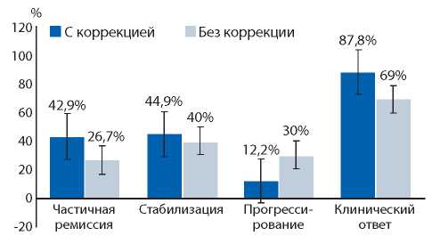 Независимо от возраста у больных мКРР на фоне на фоне 1-й линии системной терапии на основе схемы FOLFOX-6 коррекция гериатрического статуса достоверно улучшает показатели ОО (р<0,01) и клинически значимого ответа (р<0,05); рис. 1.