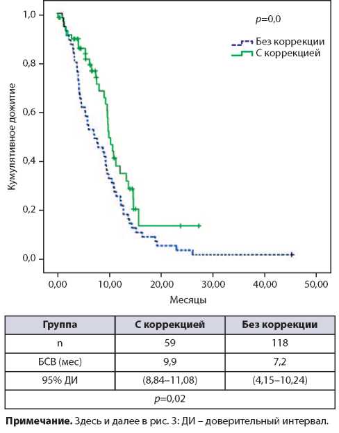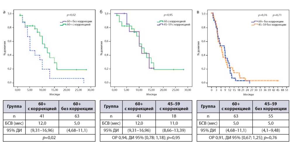 Таким образом, КГС позволяет улучшить показатели БСВ у больных старше 60 лет (р=0,02): медиана БСВ больных пожилого возраста в группе с коррекцией составила 12,0 [9,31–16,96)], а в группе без коррекции – 5,0 [4, 68–11, 1]; рис. 3, а. В группе больных с коррекцией возраст не оказывал значимого влияния на БСВ (р=0,95): медиана составила 12,0 [9, 31–16, 96] и 11,0 [8, 66–13, 39] соответственно для пожилого и среднего возраста (рис. 3, б). В группе без коррекции пациенты пожилого и среднего возраста медиана БСВ низкая и составила 5,0 мес в обеих группах (рис. 3, в).