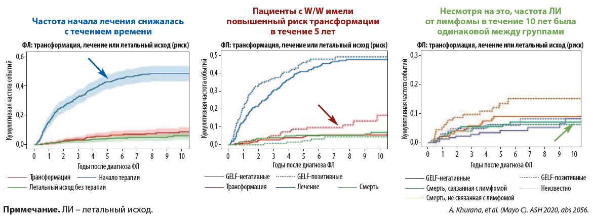 У пациентов, которые соответствовали критериям начала лечения, оно инициировалось чаще в течение первых 2 лет (33,2% против 21,9%) и чаще диагностировалась трансформация в диффузную В-крупноклеточную лимфому (ДВККЛ) в течение 5 лет (8,7% против 4,5%). Несмотря на это, частота летальных исходов от ФЛ в течение 10 лет не различалась между пациентами, удовлетворяющими критериям начала лечения и без таковых – 6,2% против 7,1%.