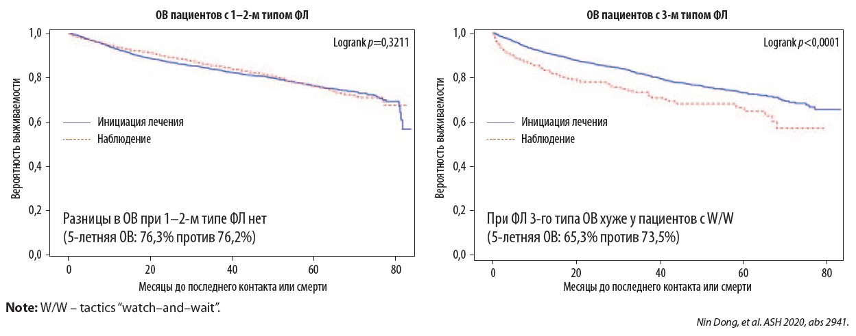 Еще одно популяционное исследование включило пациентов с распространенными стадиями из Национальной онкологической базы данных 2011–2016 гг. (NCDB); abs 2941 (рис. 3) [3]. Изучены данные 14 417 пациентов с III/IV стадиями ФЛ, большинство из которых (75%) получали лечение, а 25,4% – находились под наблюдением. Пациенты без лечения были старше, больше женщин, чаще имели предыдущие злокачественные новообразования. ФЛ 1–2-го типа диагностирована в 13 050, а ФЛ 3-го типа – в 4286 случаях. Пациенты с ФЛ 1–2-го типа не имели различий в ОВ в зависимости от того, получали они специфическое лечение или нет, в отличие от популяции с 3-м цитологическим типом ФЛ, для которых отсрочка лечения негативно сказалась на показателях ОВ.