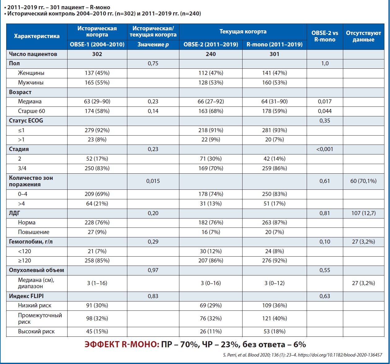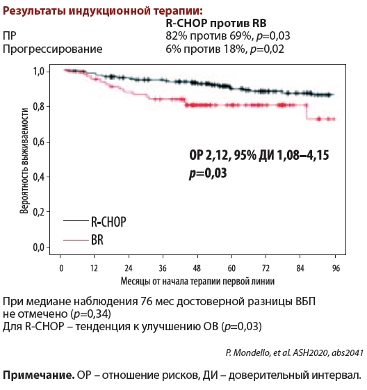 Несмотря на неблагоприятный профиль со стороны характеристик опухоли, эффективность лечения при использовании режима R-CHOP оказалась значимо выше – ПР 82% против 69% в группе RB (р=0,02). При медиане наблюдения 76 мес достоверной разницы в ВБП не отмечено, но в группе R-CHOP наблюдалась тенденция к улучшению ОВ. Отмечено значительное преимущество в ВБП при использовании поддерживающей терапии ритуксимабом (р=0,02) без отклика со стороны ОВ (р=0,49). Частота ранних рецидивов (POD24) оказалась идентичной в обеих группах: 24 и 28% соответственно. Несмотря на отсутствие разницы в ОВ, создается впечатление о преимуществе использования антрациклинсодержащего режима у молодых пациентов с высокой метаболической активностью опухоли [5].