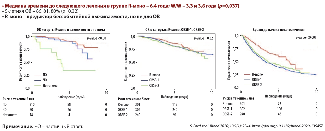 Рис. 4. Монотерапия ритуксимабом (R-моно) или W/W при распространенных стадиях ФЛ с бессимптомным течением.