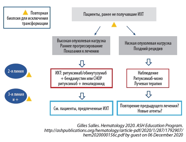 Стратегия терапии отличается у пациентов наивных и предлеченных иммунохимиотерапией (ИХТ). Для когорты, получившей лучевую терапию или монотерапию ритуксимабом и нуждающейся в новом лечении, следующая линия в большинстве случаев состоит из режима ИХТ. На этом этапе приемлемы все режимы, ранее рассмотренные в качестве опций 1-й линии. Недавно одобренная комбинация леналидомид + ритуксимаб (R2) также является возможным вариантом. Для пациентов ослабленных, пожилых или с низкой опухолевой нагрузкой и длительным ответом на монотерапию ритуксимабом (>5 лет) подход ритуксимаб-моно может быть повторен, также может быть использована лучевая терапия (см. рис. 9).