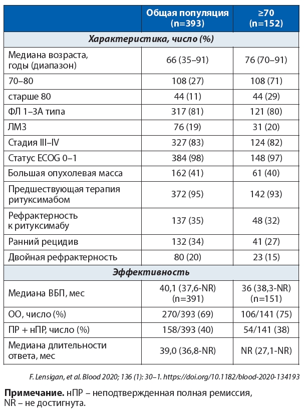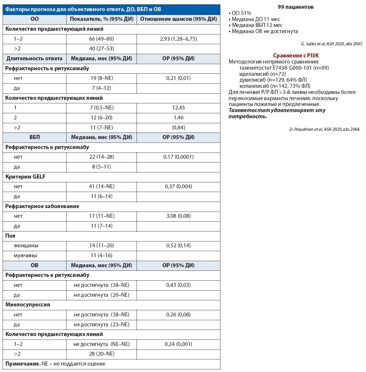 В открытом многоцентровом исследовании (NCT01897571) оценивался ингибитор гистон-метилтрансферазы таземетостат в 3-й линии терапии ФЛ в дозе 800 мг перорально 2 раза в день (abs 2047): ОО составил 51%, медиана длительности ответа – 11 мес, медиана ВБП – 12 мес, медиана ОВ не была достигнута. Прогностическое моделирование с использованием 17 базовых переменных выявило возможные предикторы эффективности: для ОО – число предшествующих линий терапии; в качестве возможных предикторов длительности ответа – рефрактерность к ритуксимабу и количество предшествующих линий терапии; для ВБП – рефрактерность к любой терапии, критерии GELF и пол. Несмотря на скромную частоту объективных ответов, возможность получения длительных ремиссий для пациентов в 3+ линии терапии является весьма ценным достижением.