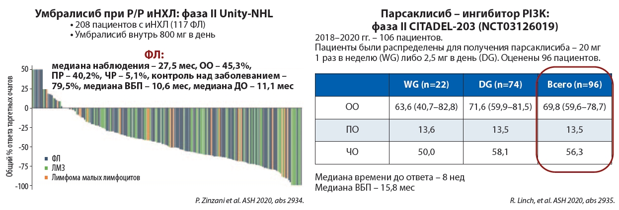 Умбралисиб – пероральный двойной ингибитор фосфатидилинозитол-3-киназы дельта (PI3Kδ) и казеин киназы-1ε (CK1e) – использовался в исследовании II фазы UNITY-NHL (NCT02793583) в качестве монотерапии у ранее леченных больных НХЛ. Включены 208 пациентов с иНХЛ (69 – ЛМЗ, 117 – ФЛ и 22 – хронический лимфолейкоз). Препарат использовался у интенсивно предлеченных пациентов, для которых зарегистрированные терапевтические опции были исчерпаны. Это делает полученные результаты еще более ценными: ОО достигнут почти у 1/2 пациентов (45,3%), при этом в большинстве случаев в виде стойкой ПР (40,2%) с медианой длительности ответа – 11,1 мес (abs 2934); рис. 14 [6].