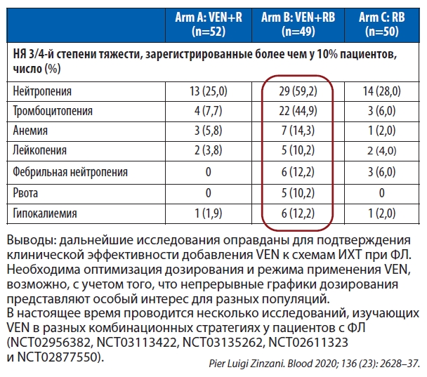 VEN+RB продемонстрировал самую высокую токсичность при более низкой интенсивной дозе RB, в сравнении с дозоинтенсивностью режима RB группе C – без венетоклакса (частота НЯ 3/4-й степени равна 93,9% против 60,0%), но при этом эффективность была сопоставимой. Оптимизация дозы и графика введений может улучшить эффективность и переносимость режима VEN+RB, в то время как данные VEN+R требуют дальнейшего изучения.