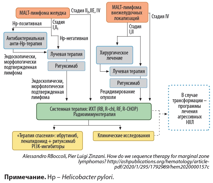 Выбор инициального лечения при локальных стадиях внежелудочных MALT-лимфом согласно имеющимся рекомендациям основывается на возможностях локорегионарной терапии (хирургия и лучевая терапия); рис. 24.