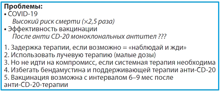В настоящее время мы переживаем сложный период и приобщаемся к новым условиям специализированной помощи пациентам с иНХЛ. Профессор G. Salles в заключении своего пленарного доклада отметил повышенный риск фатальных осложнений при инфицировании COVID-19, акцентировал внимание на подходы мониторинга с минимальным количеством визитов и переходом на дистанционные формы консультирования, призвал к активному применению тактики «наблюдай и жди» при отсутствии показаний к лечению, а при их наличии – воздержанию в период пандемии от использования бендамустина и анти CD-20-моноклональных антител. Активно обсуждались вопросы вакцинации для пациентов с иНХЛ, многие из которых на сегодняшний день остаются без ответа. Исключением являются пациенты в ремиссии, которые в течение минимум 6 мес не получали иммуносупрессивную терапию, в том числе анти-CD-20-моноклональные антитела, для которых вакцинация от COVID-19 может принести наибольшую пользу (рис. 28).