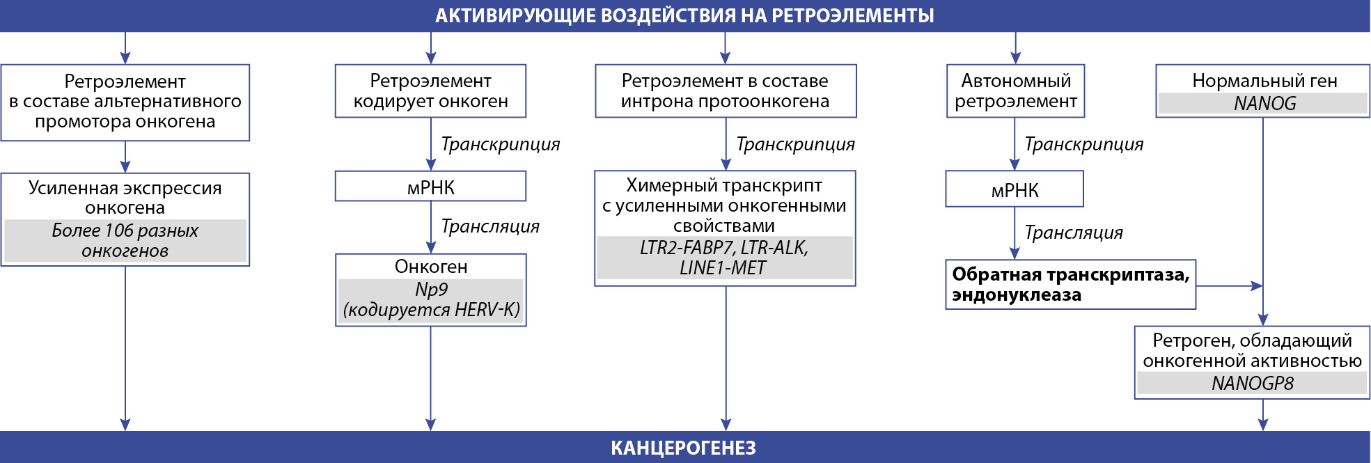 Имеется ряд примеров онкоэкзаптации РЭ за счет использования их регуляторных областей в качестве альтернативных промоторов. При этом гипометилирование LINE1, характерное для ЗНО человека, приводит к активации нижележащих протоонкогенов, которые в норме метилированы. При метастазах колоректального рака было обнаружено гипометилирование LINE1, которое ведет к активации протоонкогенов MET, RAB3IP и CHRM3 [4]. Распространенной особенностью клеток лимфомы Ходжкина является дерепрессия подсемейства THE1 LTR-РЭ MaLR, которые служат драйверами экспрессии протоонкогена CSF1R (colony-stimulating factor 1 receptor), вовлеченного в патогенез данного ЗНО [3]. Регуляторные последовательности эндогенного ретровируса LOR1a оказались причиной активации другого онкогена – IRF5 (interferon regulatory factor 5) при лимфоме Ходжкина [5]. Помимо активации протоонкогенов за счет образования эктопических промоторов и формирования химерных онкогенов РЭ могут вызывать возникновение ретрогенов, обладающих онкогенной активностью. Примером является NANOGP8 в геноме человека, экспрессирующийся преимущественно в злокачественных клетках и образованный в эволюции путем ретротранспозиции родительского гена NANOG около 0,9–2,5 млн лет назад. Продукт гена NANOG синтезируется в основном в эмбриональных стволовых клетках при нормальном развитии человека [42]. Таким образом, анализ научной литературы позволил сделать вывод, что канцерогенез стимулируется РЭ за счет взаимодействия с онкогенами четырьмя различными механизмами (рис. 1):