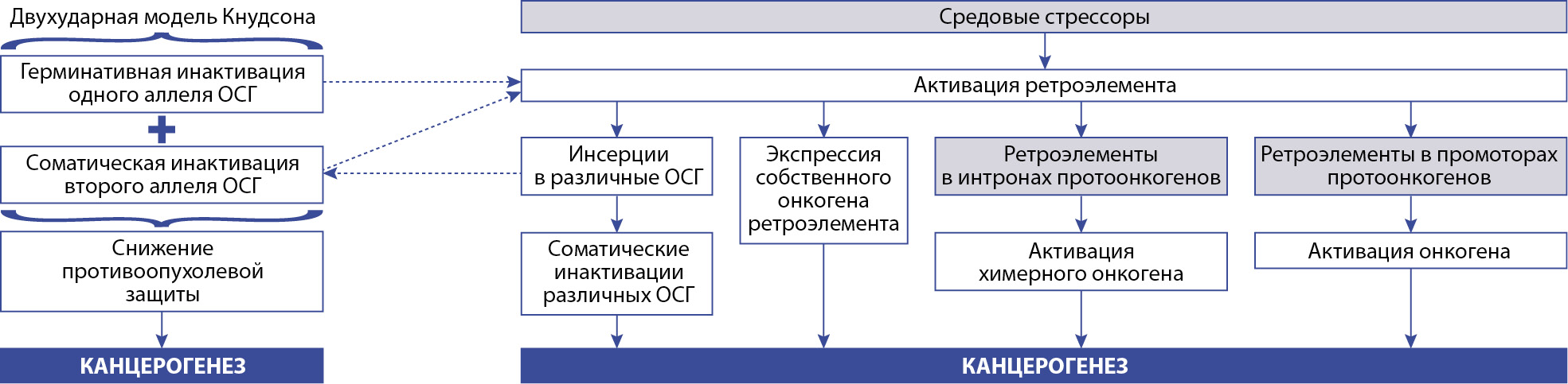 Помимо влияния РЭ на функционирование ОСГ сами онкосупрессоры участвуют в контроле транскрипции транспозонов. Так, белок RB связывается с транскрипционным фактором E2F, рекрутируя его в область промоторов LINE1-элементов, вызывая их подавление путем модификаций ДНК и гистонов. Соответственно, инактивация RB может вызывать повышение экспрессии и транспозиций LINE1 с последующей геномной нестабильностью, характерной для ЗНО [13]. То есть существует взаиморегуляция РЭ с онкосупрессорами, которые влияют на активность специфических РЭ. Это позволяет по-новому взглянуть на двухударную модель Кнудсона при НОС, согласно которой ЗНО развивается вследствие двух мутационных событий. Мутация одного аллеля ОСГ наследуется через половые клетки, а изменение второго аллеля происходит в соматических клетках. Вследствие этого происходит полная инактивация онкосупрессорной функции, что приводит к злокачественному росту [57]. Однако вероятность инактивации второго аллеля мала, и даже при ее возникновении данного события недостаточно для канцерогенеза, так как существует множество ОСГ, препятствующих злокачественной трансформации. Для развития ЗНО необходимо не менее 5–9 мутаций в разных ОСГ и онкогенах [58].