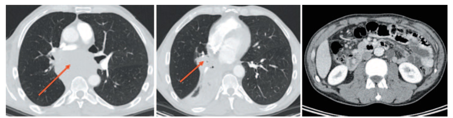 Рис. 2. МСКТ до начала терапии (июнь 2017 г.). Центральный рак правого легкого с поражением правого нижнезонального бронха с переходом на среднедолевой, главный бронхи. Метастазы во внутригрудных лимфоузлах, нельзя исключить переход процесса на область бифуркации трахеи, правую легочную артерию. Неорганные узловые образования в брюшной полости – канцероматоз брюшины. / Fig. 2. Multispiral computed tomography (MCT) before the therapy (June 2017). Centrally located right lung cancer with the lesion on the right lower lobe bronchus with the damage of the middle lobe bronchus and the primary bronchi. Intrathoracic lymph nodes metastases, it is not inconceivable that the damage took the area of bifurcation of the trachea, the right pulmonary artery. Inorganic abdominal mass – peritoneal carcinomatosis.