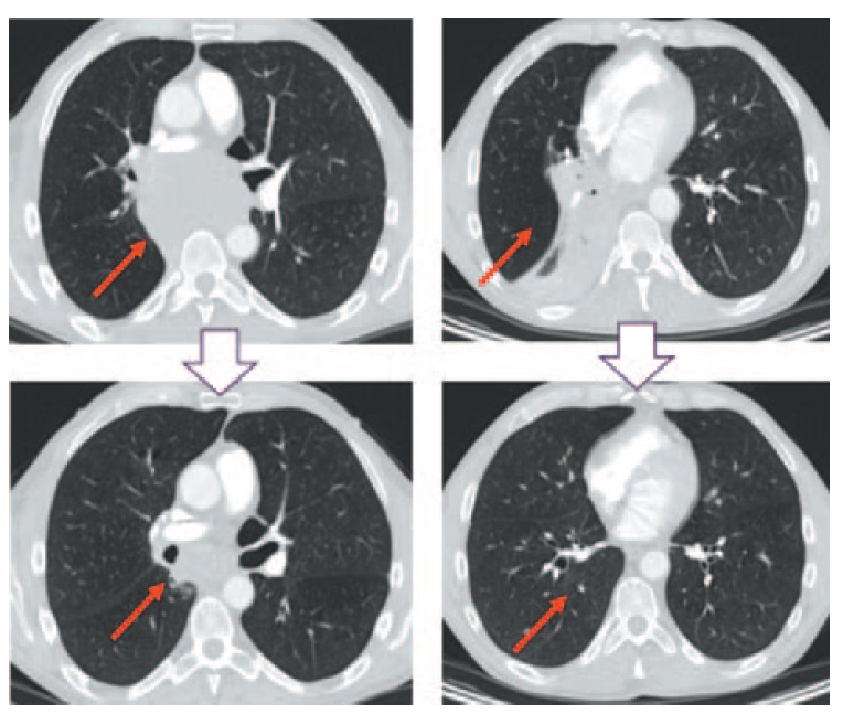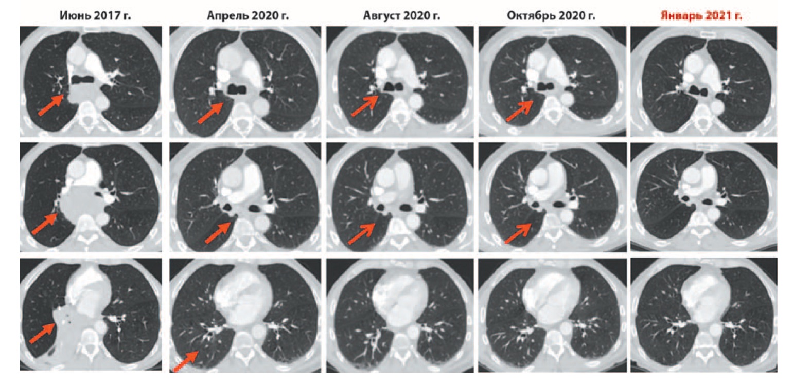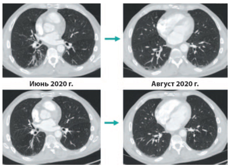 В июне 2020 г. при контрольной компьютерной томографии – КТ (рис. 5) у пациента выявлена правосторонняя нижнедолевая пневмония. Клинические проявления пневмонии отсутствовали, также не было выявлено отклонений лабораторных показателей. По результатам тестирования методом полимеразной цепной реакции РНК возбудителя COVID-19 не обнаружена. Также не выявлено антител классов IgM и IgG к возбудителю COVID-19. По согласованию с мультидисциплинарной комиссией решено продолжить иммунотерапию в прежнем режиме. По данным КТ грудной клетки от августа 2020 г. (см. рис. 5) отмечен регресс правосторонней нижнедолевой бронхопневмонии.