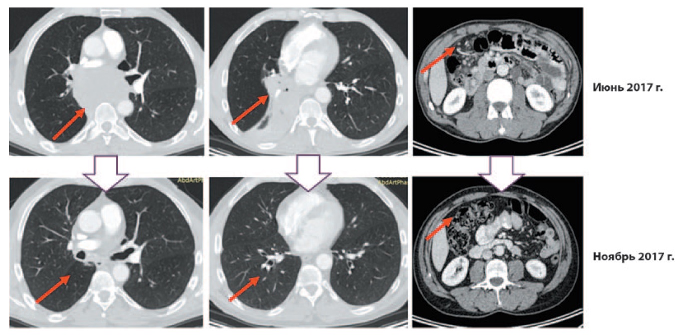 В августе 2017 г. выполнено первое контрольное обследование. По сравнению с МСКТ от июня 2017 г. при МСКТ от августа 2017 г. (рис. 3) отмечено уменьшение размеров опухолевого конгломерата в области корня правого легкого, переходящего на заднее средостение. Визуализировались отдельно расположенные фрагменты конгломерата – увеличенные бронхолегочные лимфоузлы размерами 24×20 и 20×12 мм, а также бифуркационные лимфоузлы размером 49×29 мм. Также отмечено восстановление просветов промежуточного, нижнезонального бронхов, В6. Правая легочная артерия прослеживалась отчетливо, признаки сужения отсутствовали, однако сохранялась небольшая компрессия нисходящей ветви правой легочной артерии. Также визуализировались отдельно расположенные внутригрудные лимфоузлы левой бронхолегочной и паратрахеальной групп без признаков увеличения. Отмечено уменьшение размеров параэзофагеального лимфоузла справа до 10×8 мм. В области брюшины сохранялись неорганные узловые образования, накапливающие контрастный препарат, размерами до 6 мм.