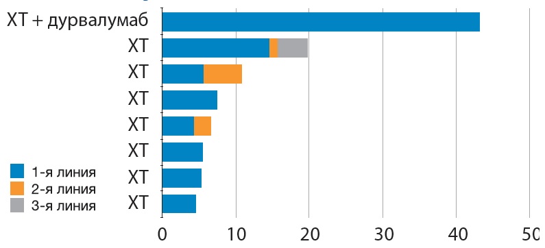 Несмотря на исходно высокую частоту ответа, практически у всех больных рМРЛ развивается рецидив/прогрессия заболевания на фоне стандартной ХТ 1-й линии [6]. В результате прогноз в отношении отдаленных результатов лечения пациентов с рМРЛ был весьма неблагоприятен: медиана общей выживаемости (мОВ) не превышала 12 мес, а показатели 2- и 5-летней выживаемости составляли менее 5% и 1–2% соответственно [2, 5]. Применение химиоиммунотерапии (ХТ+ИТ) при рМРЛ привело к значимому улучшению показателей выживаемости впервые за несколько десятилетий [6].