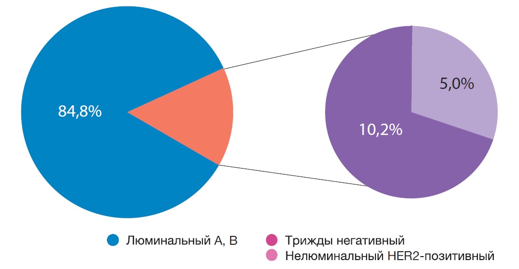 Материалом данного исследования послужили образцы опухолевой ткани и костного мозга. Всего включены 99 больных РМЖ, которые прошли обследование и получили лечение в условиях ФГБУ «НМИЦ онкологии им. Н.Н. Блохина». Возраст больных варьировал от 26 до 83 лет, средний возраст – 54,9±11,2 года. Диагноз у всех больных поставлен на основании клинических, рентгенологических и морфологических данных. Люминальный РМЖ (ЛРМЖ) диагностирован у 84,8% (n=83) больных, из которых у 39,7% (n=33) верифицирован люминальный подтип А; у 49,5% (n=41) – В-HER2-негативный подтип; у 10,8% (n=9) – В-HER2-позитивный подтип. Erb-B2 сверхэкспрессирующий (HER2+) подтип РМЖ диагностирован в 5,0% случаев (n=5), трижды негативный подтип РМЖ – в 10,2% (n=10); рис. 1. В соответствии с данными патоморфологического исследования в большинстве случаев РМЖ соответствовал стадии Т1 (51,5%) и Т2 (44,4%), стадия Т3 установлена у 2,0% больных. Метастатическое поражение лимфоузлов (N+) наблюдалось в 39,4% (n=39), в остальных случаях лимфоузлы интактны (N0). Чаще всего степень злокачественности опухоли соответствовала G2 (80,8%).