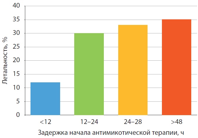 Летальность от кандидемии напрямую коррелирует с задержкой начала адекватной противогрибковой терапии [11, 12] (рис. 1).
