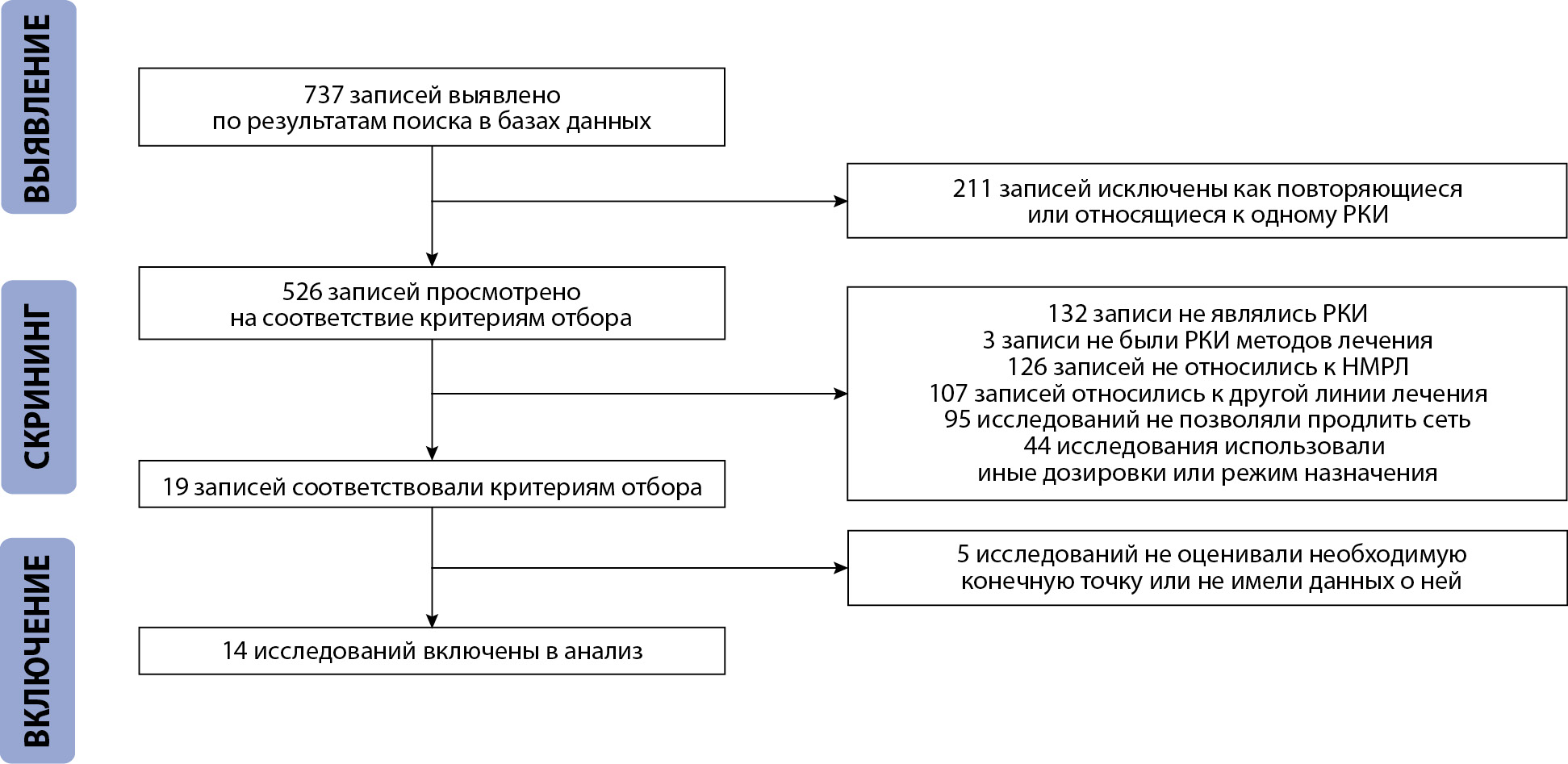 Отбор исследований. Критериями отбора исследований являлись: дизайн параллельного рандомизированного контролируемого испытания (РКИ), участие пациентов только с подтвержденным EGFR-положительным мНМРЛ, отсутствие предшествующей лекарственной терапии по поводу заболевания, для исследуемых препаратов – использование только в виде монотерапии в одобренных режимах и дозировках (афатиниб 40 мг 1 раз в день, осимертиниб 80 мг 1 раз в день). Исследования исключались, если они не изучали необходимую конечную точку или соответствующие результаты отсутствовали.