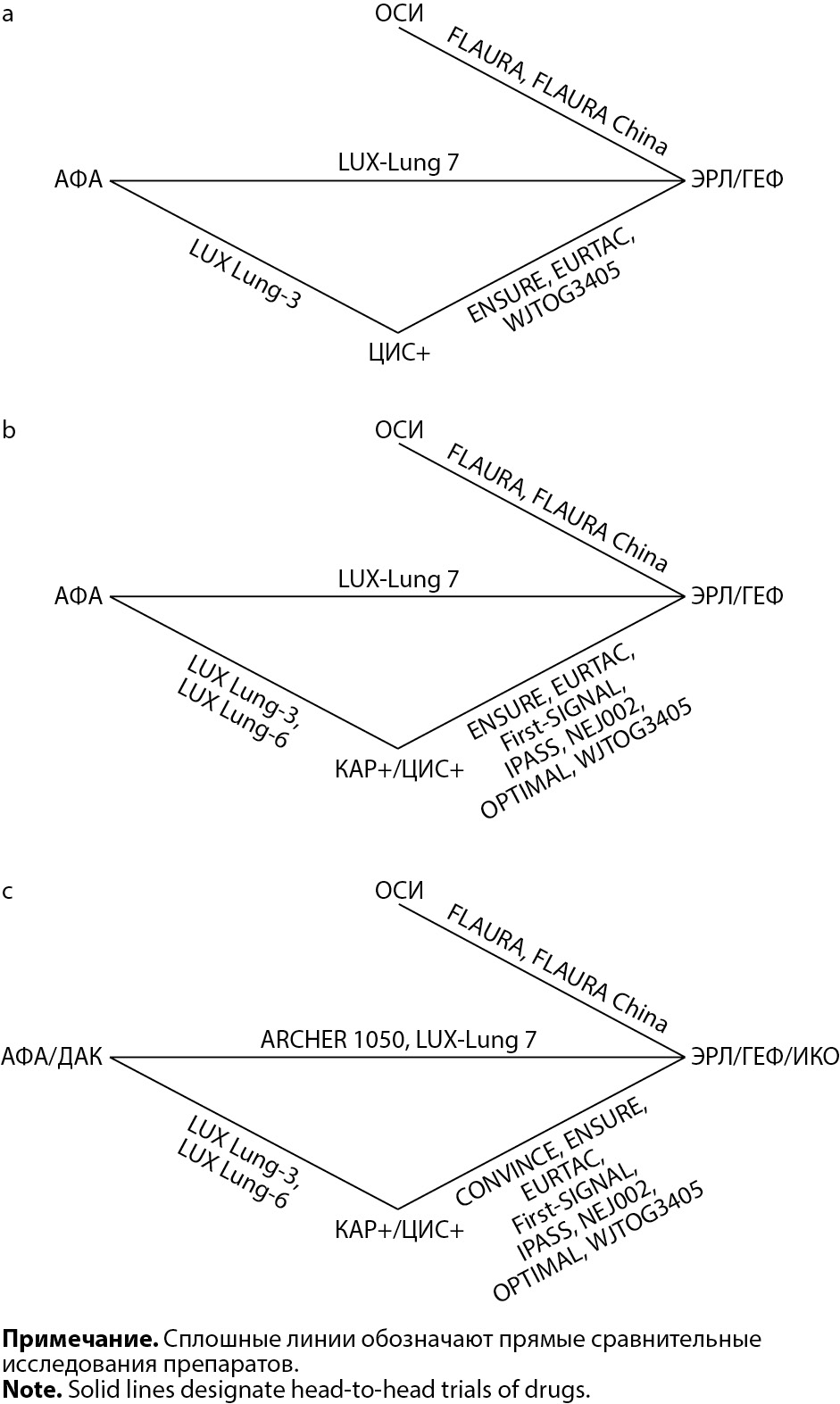 Стандартом лечения EGFR-положительного мНМРЛ являются ингибиторы тирозинкиназы (ИТК) [1]. Каждое новое поколение ИТК по свойствам отличается от предыдущего, что теоретически обещает больший потенциал замедления EGFR-опосредованного опухолевого роста и, следовательно, улучшение результатов лечения мНМРЛ. Гефитиниб и эрлотиниб – представители ИТК I поколения (1G) и обеспечивают обратимую блокаду передачи сигнала с EGFR. Афатиниб – наиболее распространенный представитель ИТК II поколения (2G) и по сравнению с ИТК IG обеспечивает необратимый характер блокады передачи сигнала с EGFR и эффективен в отношении большего количества его разновидностей. Афатиниб продемонстрировал большую длительность выживаемости без прогрессирования (ВБП) по сравнению с гефитинибом [5]. Осимертиниб относится к ИТК III поколения (3G) и по сравнению с афатинибом обладает большей селективностью к мутантным вариантам EGFR и меньшей – к рецепторам дикого типа. Таким образом, сравнение клинической эффективности афатиниба и осимертиниба представляет клинический интерес. На текущий момент нет прямых сравнительных клинических испытаний этих препаратов. В такой ситуации выходом является синтез доказательств при помощи сетевого метаанализа (СМА).