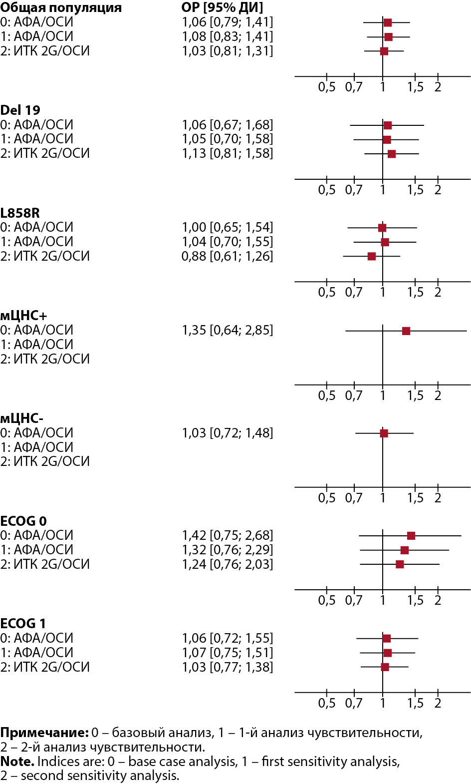 Схожим образом, среди пациентов с L858R между афатинибом и осимертинибом не было статистически значимой разницы по влиянию на ОВ: ОР 1,00 [0, 65; 1, 54], p=0,997 в базовом анализе (I2=0%, p=0,934) и 1,04 [0, 70; 1, 55], p=0,837 в 1-м анализе чувствительности (I2=0%, p=0,863). Результаты сравнения ИТК 2G с осимертинибом во 2-м анализе чувствительности также показали отсутствие между ними статистически значимой разницы по влиянию на ОВ: ОР 0,88 [0, 61; 1, 26], p=0,475 (I2=0%, p=0,627).