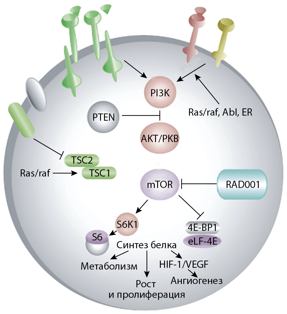 Каскад PI3K-AKT-mTOR – внутриклеточный сигнальный путь, центральными компонентами которого являются ферменты фосфоинозитид-3-киназа (PI3K), киназы AKT и mTOR. В свою очередь активация киназы mTOR оказывает влияние на рост и пролиферацию клеток (mTOR усиливает трансляцию белков, ответственных за рост и деление клеток, таких как циклин D1, запускает и стимулирует процесс клеточного роста через контрольные точки G1 и S фаз клеточного цикла), на ангиогенез (mTOR усиливает трансляцию индуцируемых гипоксией факторов HIF-1/HIF-2. Эти транскрипционные факторы управляют экспрессией генов, отвечающих за реакцию на гипоксический стресс, в том числе таких факторов роста сосудов, как сосудисто- эндотелиальный фактор – VEGF, тромбоцитарный фактор роста – PDGF и трансформирующий фактор роста – ТФР-α, и клеточный метаболизм (mTOR усиливает экспрессию транспортеров питательных веществ на поверхности клеток, повышенный доступ к питательным веществам, поддерживает рост и выживание злокачественных клеток) [13].