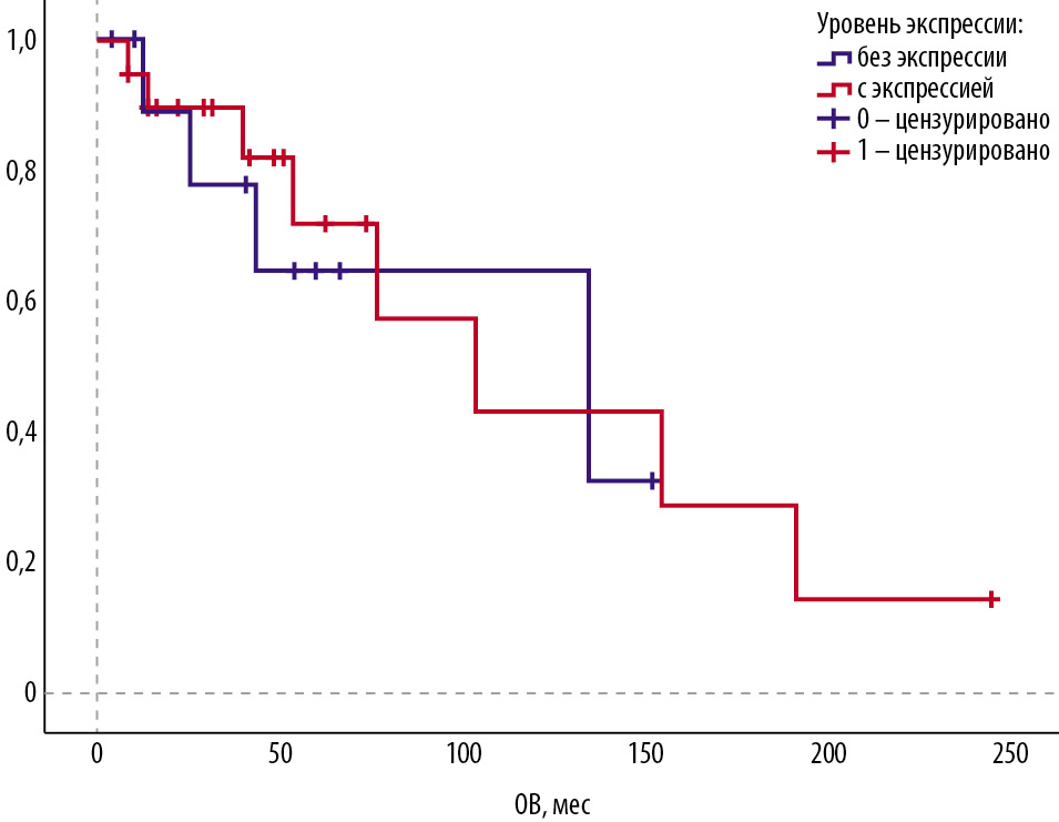Медиана ОВ в группе без экспрессии phospho-mTOR составила 135 мес (95% ДИ 0,9–269,15), в группе с экспрессией – 104 мес (95% ДИ 39–169), однако данные различия оказались статистически не достоверны (р=0,732); рис. 2.