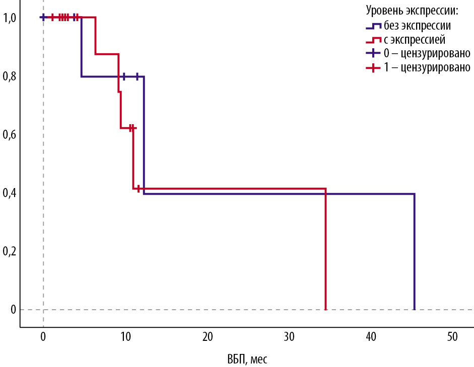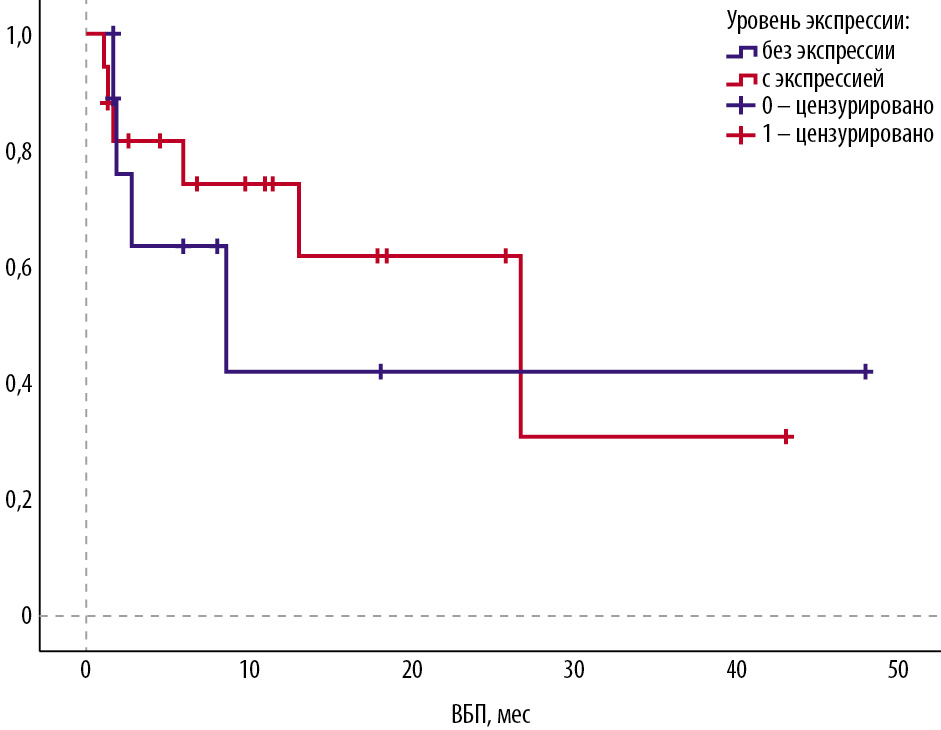 Более того, отмечается четкая тенденция увеличения медианы ВБП при использовании доксорубицинсодержащих режимов химиотерапии в группе с экспрессией phospho-mTOR по сравнению с группой без экспрессии (26,7 мес при 95% ДИ 6,9–46,6 против 8,7 мес при 95% ДИ 0–19,8 соответственно). Разница оказалась статистически недостоверной (р=0,67), что, вероятно, связано с малой выборкой пациентов (рис. 3).