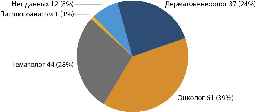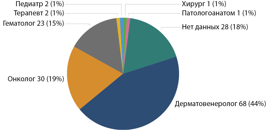 Наибольший вклад в выявление ТКЛК вносят дерматовенерологи: заболевание выявлено ими у 68 (44%) пациентов. Онкологами ТКЛК выявлены у 30 (19%) пациентов, гематологами – у 23 (15%), терапевтами – у 2 (1%), педи- атрами – у 2 (1%), хирургом – у 1 (1%), патологоанатомом (посмертно) – у 1 (1%). Данные не представлены для 28 (18%) пациентов (рис. 2).
