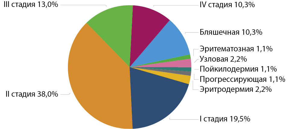 Диагноз с указанием стадии заболевания был представлен для 87 (56,1%) больных, из которых у 16 (18,3%) определение стадии не основывалось на общепринятой системе стадирования TNM – была дана лишь клиническая характеристика (эритематозная, бляшечная, узловая, пойкилодермическая, прогрессирующая форма, эритродермия). Указание стадии (I–IV) без буквенного обозначения (A, B) наблюдалось для 31 (35,6%) больного, для 2 больных указана стадия IE, для 1 больного – стадия IIIE. Таким образом, расчет доли ранних и поздних стадий был затруднен. Полученная информация о стадиях представлена на рис. 5.
