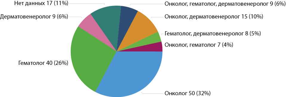 Девять (6%) пациентов состояли под наблюдением трех специалистов (онколога, гематолога и дерматовенеролога), 15 (10%) – под наблюдением онколога и дерматовенеролога, 8 (5%) – под наблюдением гематолога и дерматовенеролога, 7 (4%) пациентов – под наблюдением онколога и гематолога.