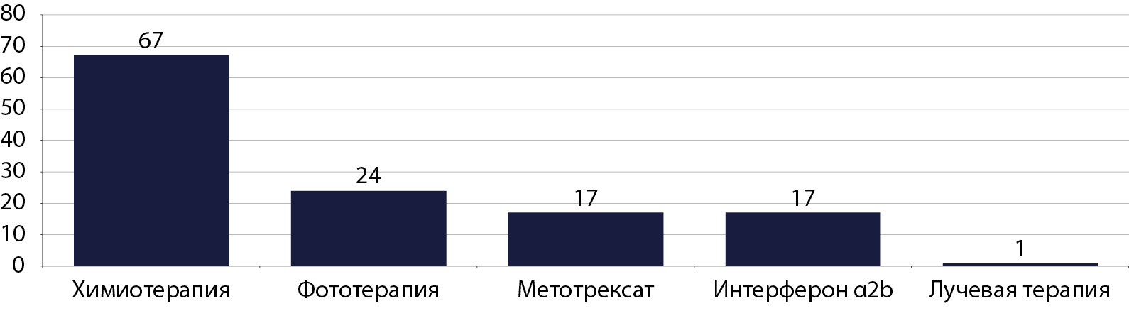 По состоянию на момент представления данных все четыре метода лечения (химиотерапия, фототерапия, терапия метотрексатом, интерферонотерапия) были проведены 5 (5,4%) из 92 пациентов; кроме того, еще 1 пациенту были проведены химиотерапия, интерферонотерапия, терапия метотрексатом и лучевая терапия. Три метода лечения были проведены 4 (4,3%) пациентам, 2 – 9 (9,8%), 1 – 74 (80,4%).