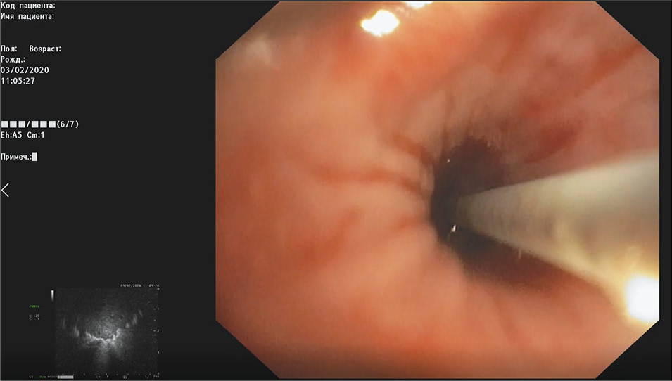 В случае сонографического выявления опухоли по тубусу-проводнику, установленному на дистальном колпачке, в проекцию данного новообразования проводятся биопсийные щипцы (рис. 4).