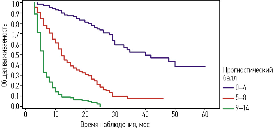 Показатели выживаемости пациентов с прогностическими баллами 0–4 (группа низкого риска), 5–8 (группа среднего риска) и 9–10 (группа высокого риска) существенно различаются (рис. 1).