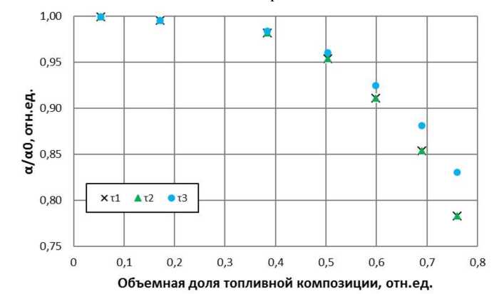 Используя известное соотношение Нордгейма-Фукса для выделившейся энергии, можно вычислить поправки к доплеровскому коэффициенту для традиционного модельного подхода (рис. 4). Под отношением α/α0 понимается отношение доплеровского коэффициента с учетом плавления силумина к доплеровскому коэффициенту без учета плавления. Приняв во внимание подобную поправку в рамках использованных подходов, можно учесть исследуемый эффект от плавления без явного его моделирования.