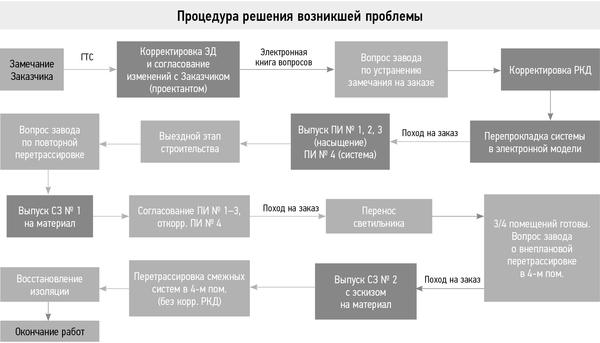 Корректировка по требованиям Заказчика после внесения изменений в ЭД включала в себя четыре помещения, в одном из которых насыщенность смежных систем и расположенного оборудования не позволила провести запланированную трассировку с первого раза. В результате решения возникшей проблемы были затронуты две смежные системы и подвод кабеля к оборудованию в этом помещении, что привело к еще большему увеличению срока закрытия вопроса. Схема решения представлена на рис. 1.