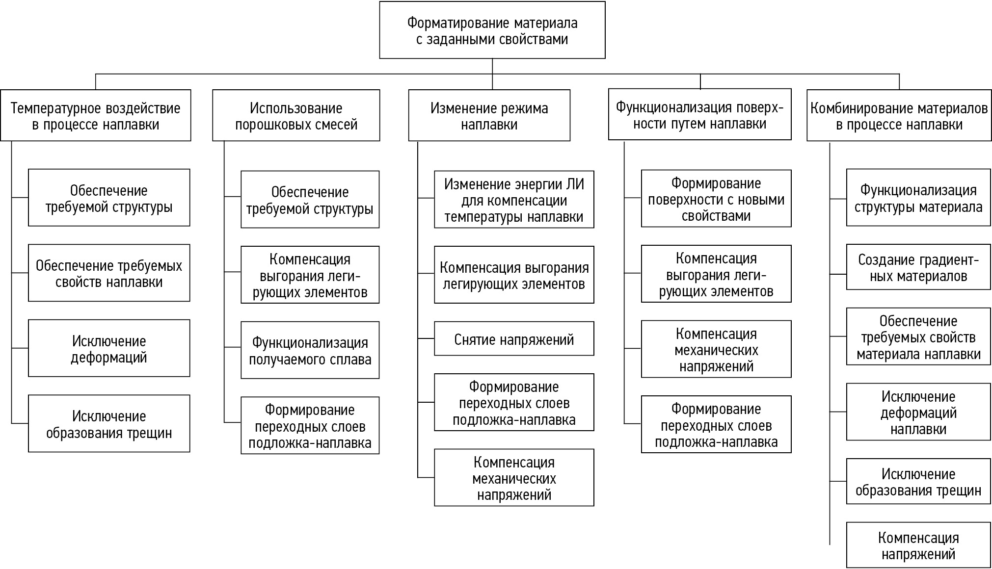 Концепция индустрии четвертой промышленной революции предполагает глубокую информатизацию производственных процессов. Бурно развивающаяся отрасль аддитивного производства, в частности прямой лазерной порошковой наплавки, предполагает автоматизацию и информатизацию процесса получения деталей [1, 2]. Стремительно развивающееся направление наплавки и 3D-печати изменило подход не только к построению конструктивных элементов и узлов, но и к получению материалов, обладающих заданными свойствами. Для достижения требуемых свойств наплавляемых слоев используются лазерные методы обработки [3–6]. Использование лазерного излучения (ЛИ) превосходит иные методы подвода энергии в зону обработки ввиду высокой когерентности, направленности, высокой плотности энергии лазерного излучения, высокой локальности и прогнозирования воздействия, низкой зоны термического влияния (ЗТВ). Лазерная наплавка используется в различных отраслях промышленности: металлургической, аэрокосмической, горнодобывающей, автомобильной, судостроительной. Процесс лазерной наплавки с использованием порошкового материала является эффективным методом ремонта, восстановления, функционализации поверхностей, создания новых деталей. В современном технологическом исполнении спектр применяемых материалов очень широк. Путем использования нескольких систем подачи возможно получение сложных структур, обеспечивающих значительное расширение технологичности производства. Получение градиентных материалов осуществимо благодаря таким преимуществам, как смешивания двух или более типов порошков, контроль скорости подачи каждого потока порошка и гибкость в управлении другими рабочими параметрами [6–10]. Мощность источника лазерного излучения, скорость обработки и скорость подачи порошка оказывают значительное влияние на качество наплавочного слоя [11]. Эти параметры предоставляют наиболее широкие возможности для изменения и улучшения свойств наносимого слоя [12]. Если параметры процесса не соответствуют требованиям, в наносимых слоях могут появиться дефекты, такие как поры и трещины. Таким образом, для достижения желаемых результатов необходимо эффективно контролировать параметры процесса [13–15]. Прогнозирование свойств материала возможно как посредством изменения параметров лазерного излучения в процессе лазерной порошковой наплавки, так и путем использования разных материалов, что представлено на рис. 1 в виде схемы.