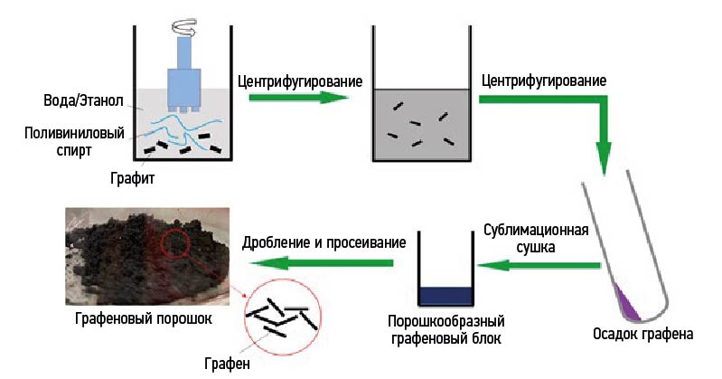 В данном исследовании выбран экологически чистый метод получения графена путем отслаивания графита в водно-этанольном растворе поливинилового спирта (ПВС), где молекулы ПВС были адсорбированы на графене, чтобы действовать как стабилизаторы против агломерации за счет пространственного отталкивания. Процесс можно описать следующей реакцией: