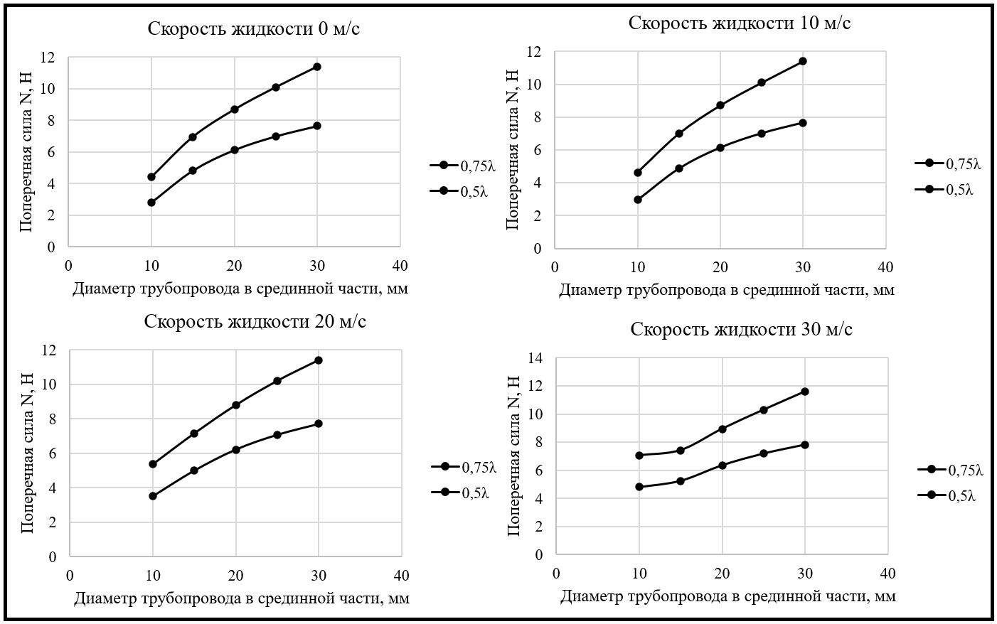 По полученным в результате расчёта значениям, представленным в табл. 8, 9 были построены графики зависимости поперечных сил от диаметра сечения трубопровода в срединной части — 10, 15, 20, 25, 30 мм, при различных скоростях движения жидкости — 0, 10, 20, 30 м/с (рис. 7).