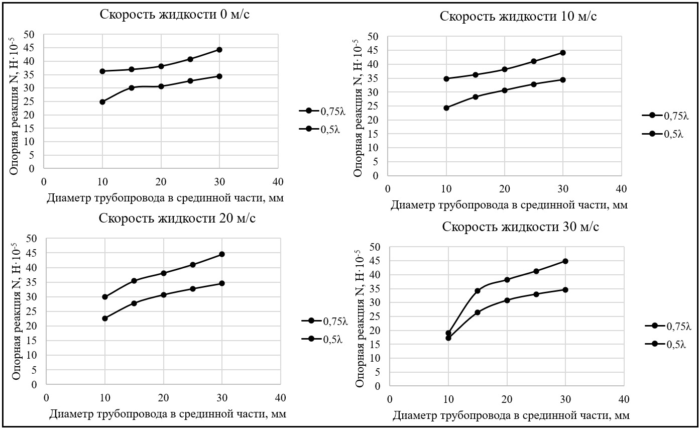 По полученным значениям, представленным в таблицах 10, 11 были построены графики зависимости опорных реакций от диаметра сечения трубопровода в срединной части — 10, 15, 20, 25, 30 мм, при различных скоростях движения жидкости — 0, 10, 20, 30 м/с (рис. 8).