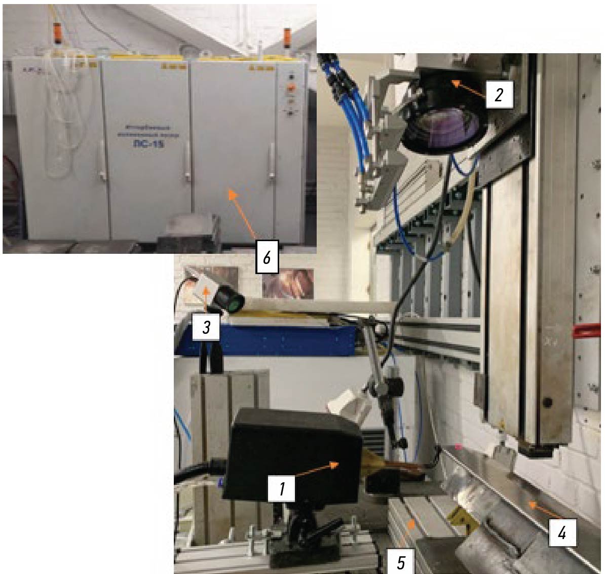 Рис. 1. Стенд для лазерно-индукционного термоупрочнения: 1 — индуктор СВЧ-6АВ; 2 — лазерная головка для сварки с гальванометром ND65; 3 — инфракрасная камера Optris PI08MTK; 4 — плоский образец из жаропрочной стали для термоупрочнения, закрепленный на сварочных магнитных упорах; 5 — 2-координатный подвижный стол; 6 — волоконный лазер ЛС-15.
