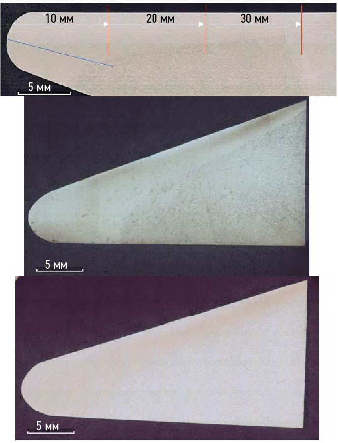 Fig. 4. Large sections of the hardened zone on the leading edge of flat test pieces with uniform cross-section: top, 15H11MF (location of hardness measurement lines on all test pieces are shown in red and blue); middle, AISI 420; bottom, EI961.