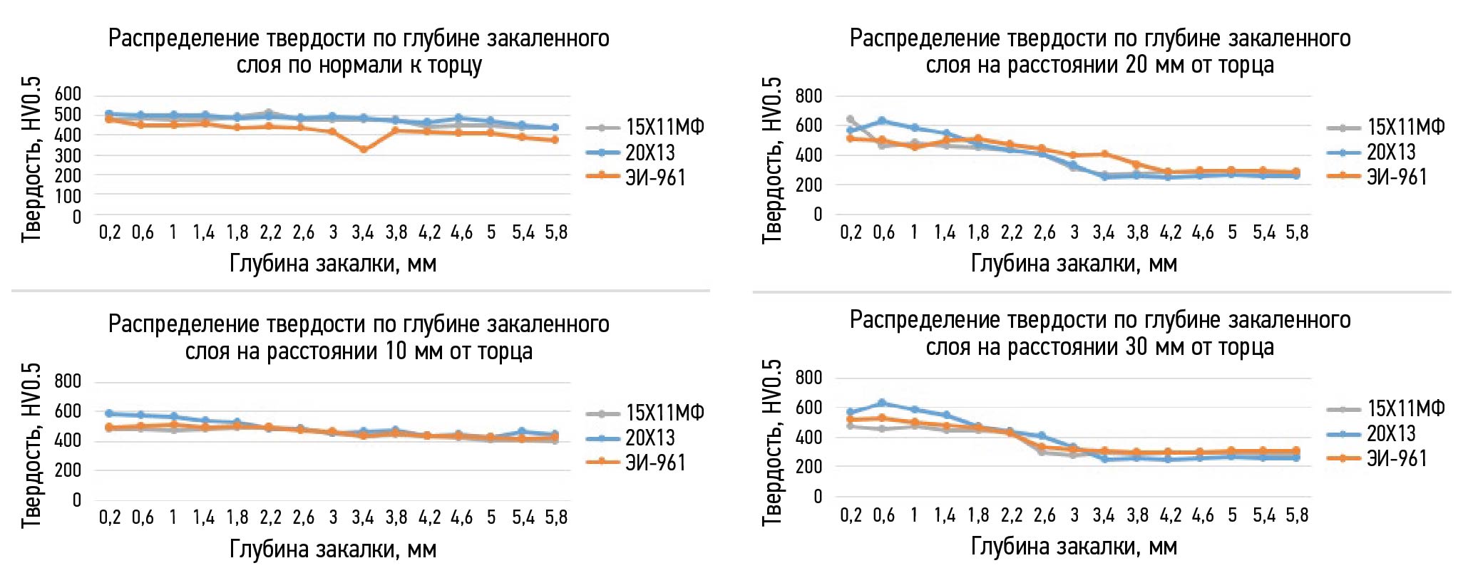 Рис. 5. Графики распределения твердости на различных участках закаленного слоя.