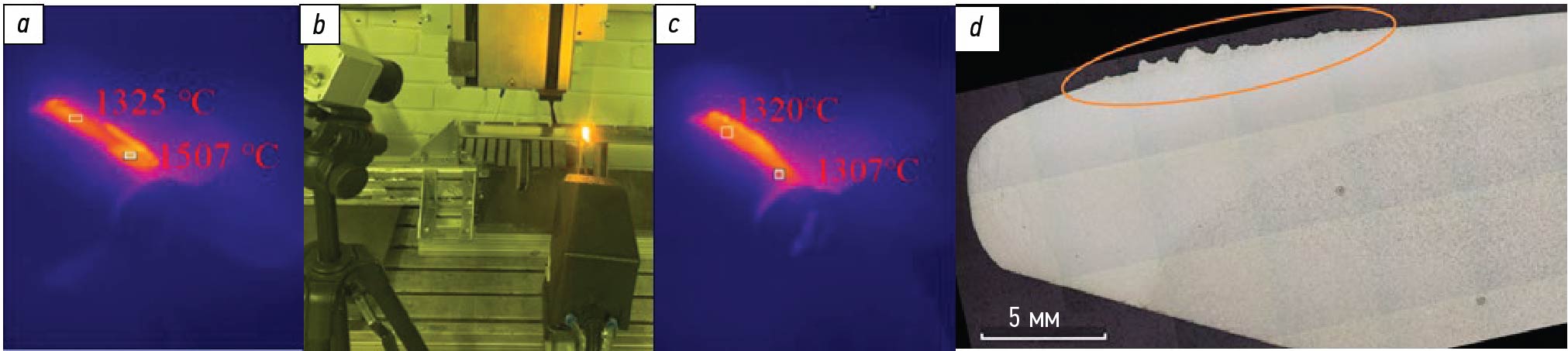 Рис. 6. Процесс термоупрочнения (b) с фиксированием температуры в области нагрева с постоянной (a) и изменяемой (c) мощностью лазера по амплитуде сканирования; макрошлиф упрочненной зоны входной кромки (d) плоского образца постоянного сечения 15Х11МФ с характерной зоной оплавления в общей зоне действия двух источников нагрева.