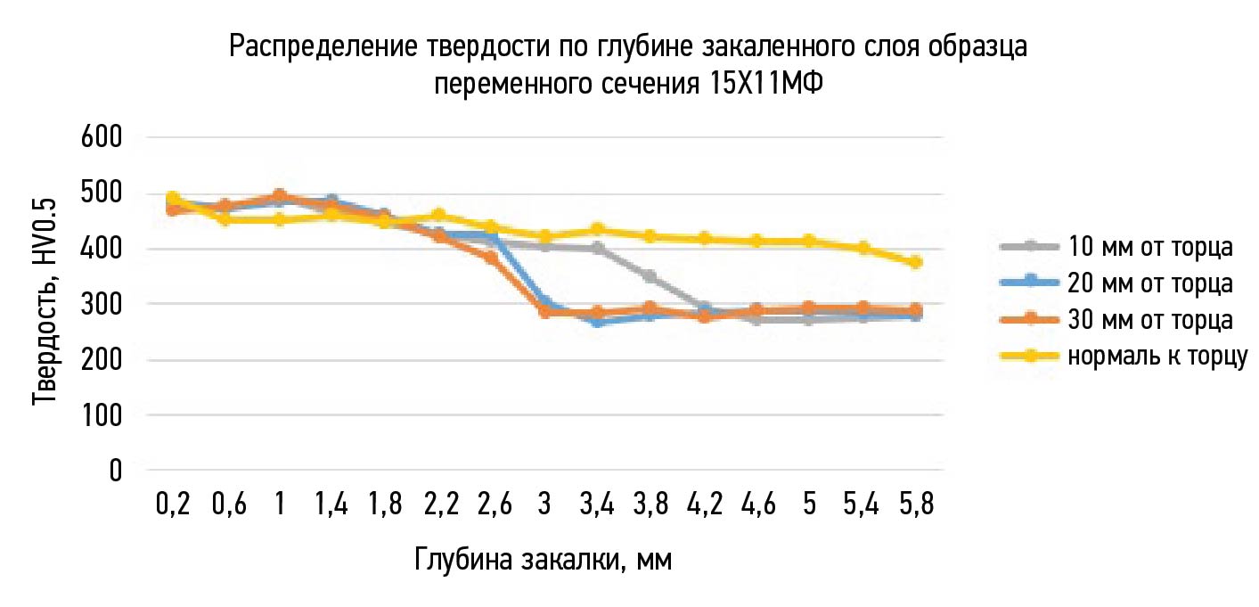 Для макрошлифа, представленного на рис. 7, была измерена твердость, результаты которой показаны на графике (рис. 8). Полученные значения аналогичны результатам, полученным для плоских образцов постоянного сечения, по глубине упрочненного слоя и значениям твердости.