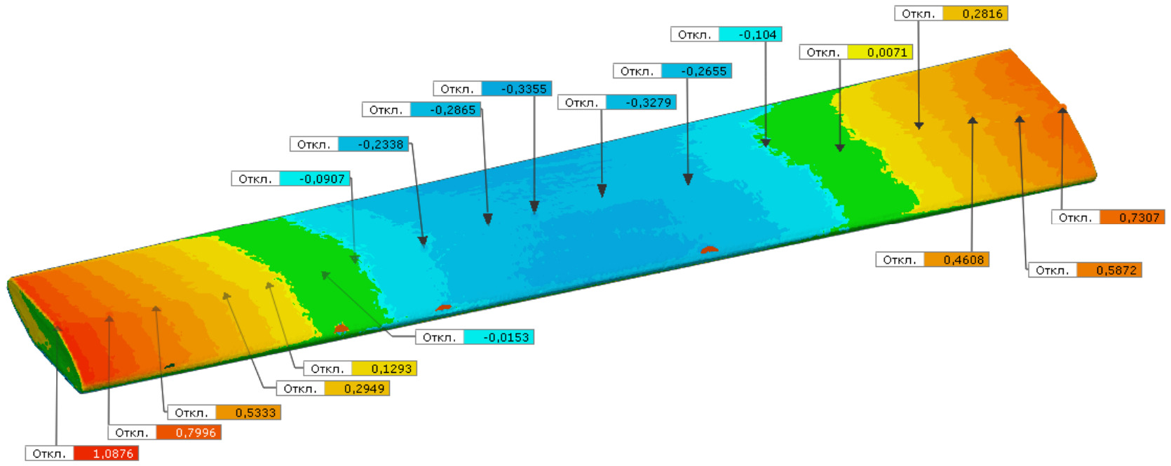 Рис. 9. Визуализация деформации пластины после термоупрочнения. Указаны значения отклонений от первоначального состояния образца до обработки в миллиметрах.