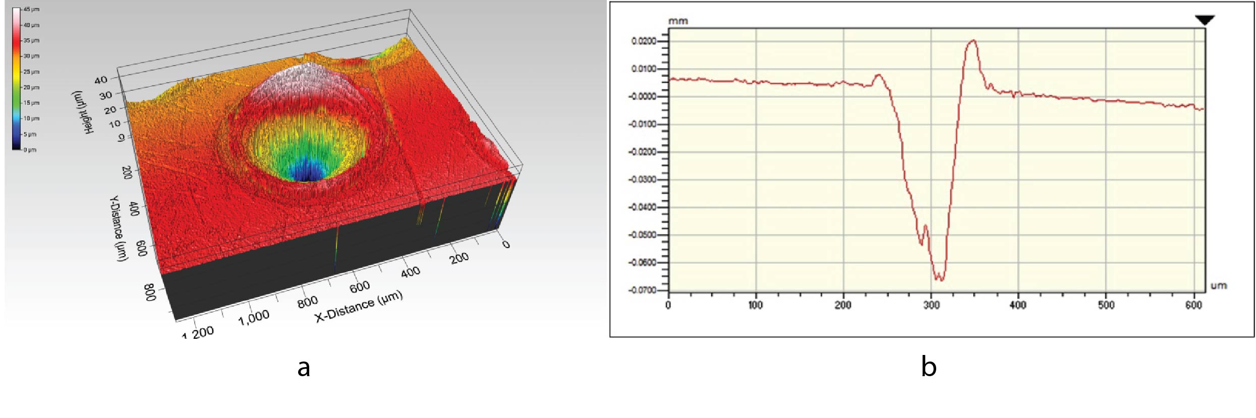 Рис. 2. Геометрические параметры микротекстуры поверхности: a — 3D-профиль текстуры на поверхности; b — параметры глубины микротекстуры.