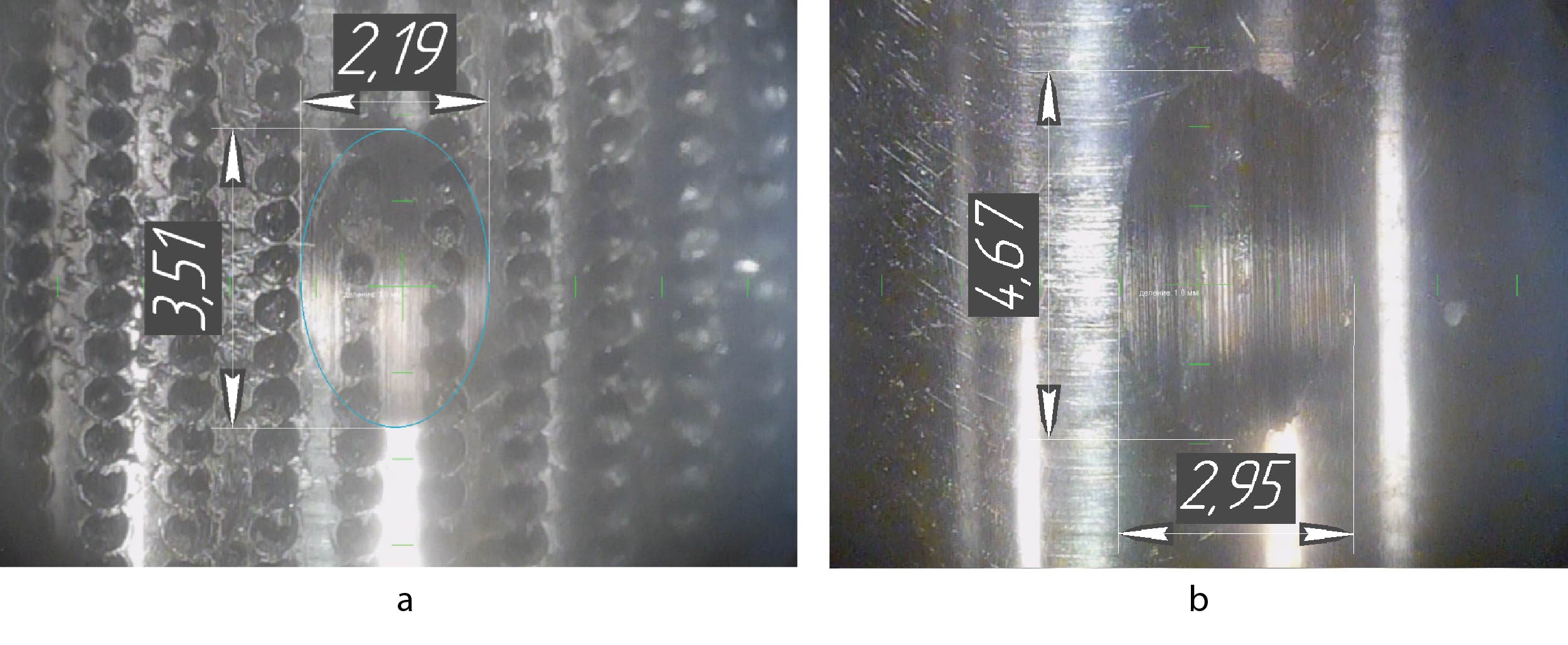 Для получения микроямок с определенными свойствами несколько лазерных импульсов подавали на поверхность (импульсный режим). Параметры лазерной обработки: напряжение 300–400 В; длительность 0,75 мс; частота 1–4 Гц. Диаметр микроямок был установлен в диапазоне 90–400 мкм и зависел от параметров обработки. Расстояние между ними варьировалось для получения различных долей структурированной площади поверхности. Для создания микротекстур в виде круглых углублений на канавке и ленточке сверла была опробована технология лазерной микрообработки с различной плотностью заполнения: 10, 20, 30 и 40 %.
