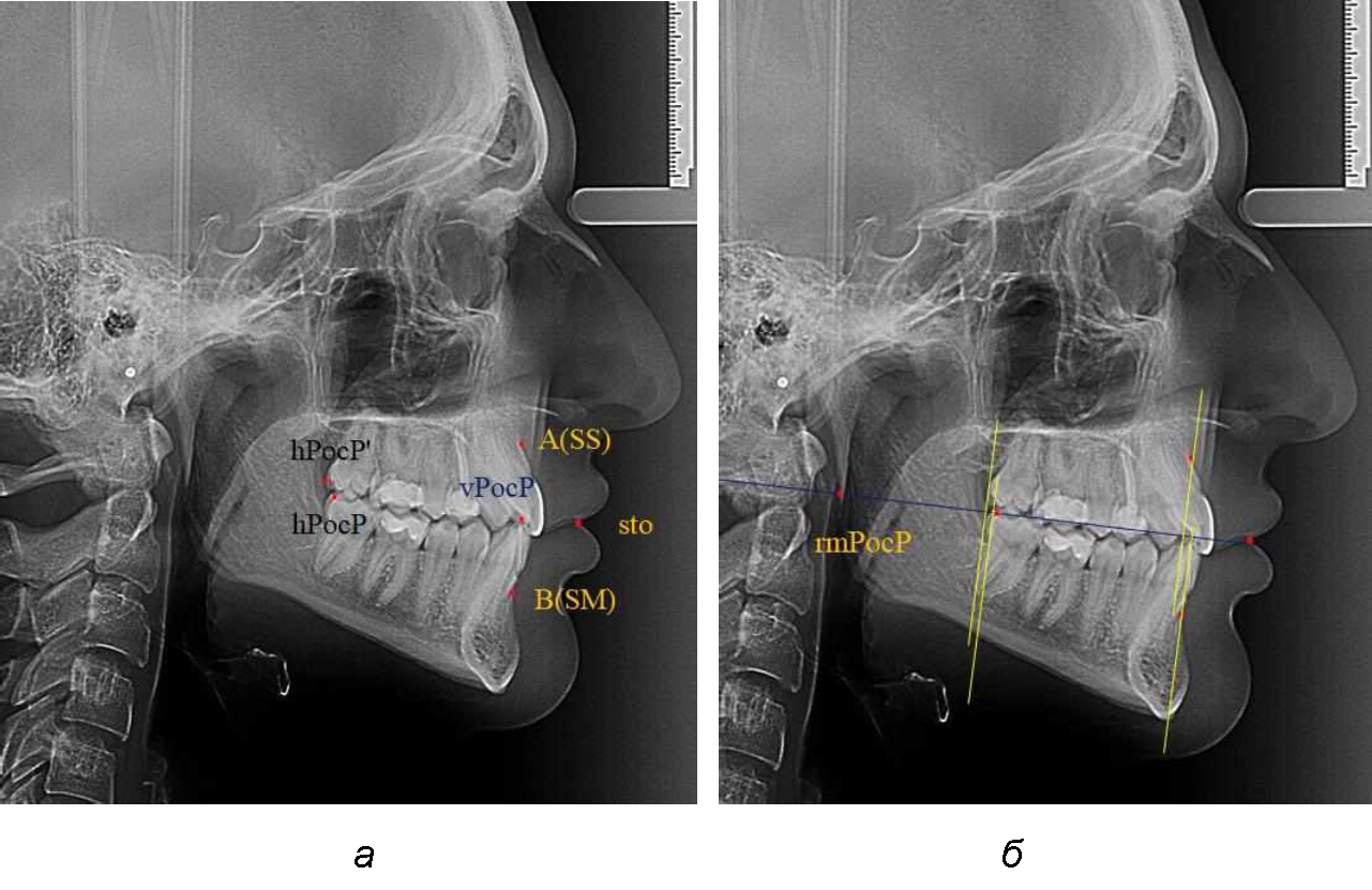 Альвеолярно-дентальный размер верхней челюсти и нижней челюсти оценивали по окклюзионной линии между вертикалями, ограничивающими исследуемые челюсти. Положение верхней челюсти оценивали по величине размера «rmOcP-А», а нижней челюсти по расстоянию «rmOcP-В». Линия смыкания губ обозначалась как точка «sto», вблизи которой проходила окклюзионная линия. Данный ориентир позволял провести окклюзионную плоскость при аномалиях положения резцов в вертикальном направлении, когда была сложность определения резцовой окклюзионной точки (vРOcP).