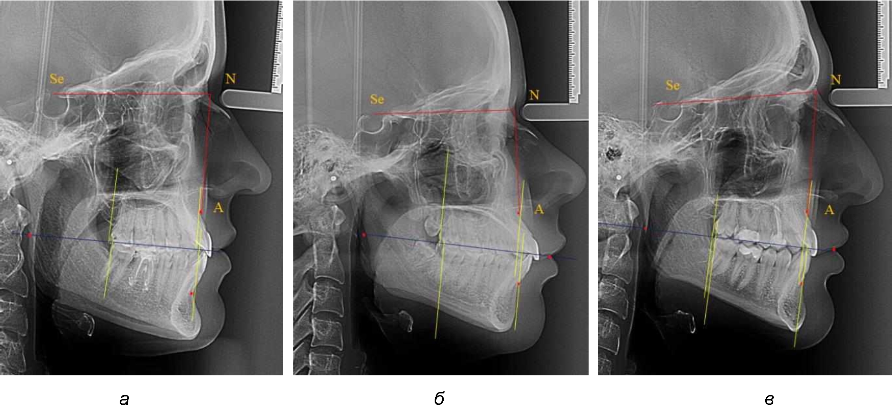 Рис. 2. Положение апикальных точек и челюстей при нормопозиции (а), антепозиции (б) и ретропозиции (в) верхней челюсти